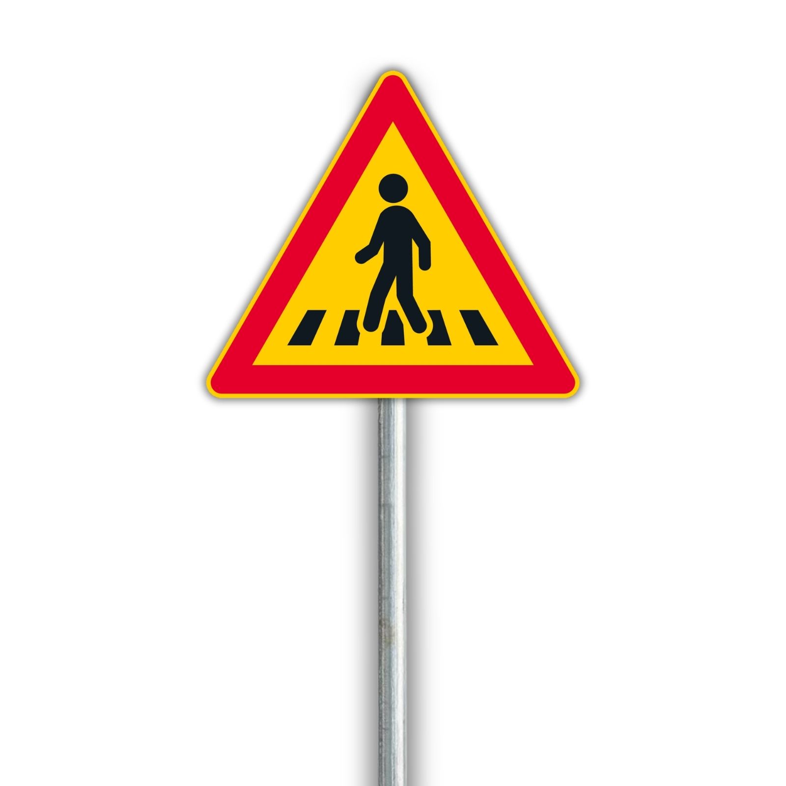 Varoitusmerkki, joka varoittaa suojatiestä.