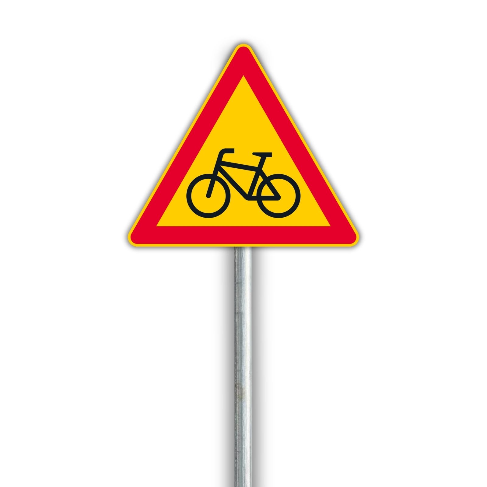 Varoitusmerkki, joka varoittaa pyöräilijöistä ajoradalla.