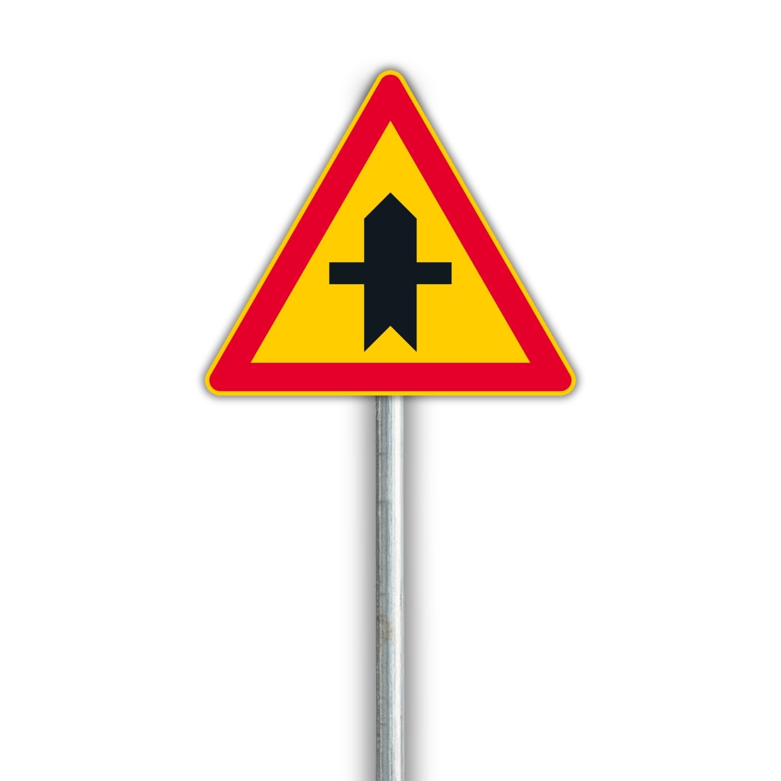 Varoitusmerkki, joka varoittaa sivutien risteyksestä.