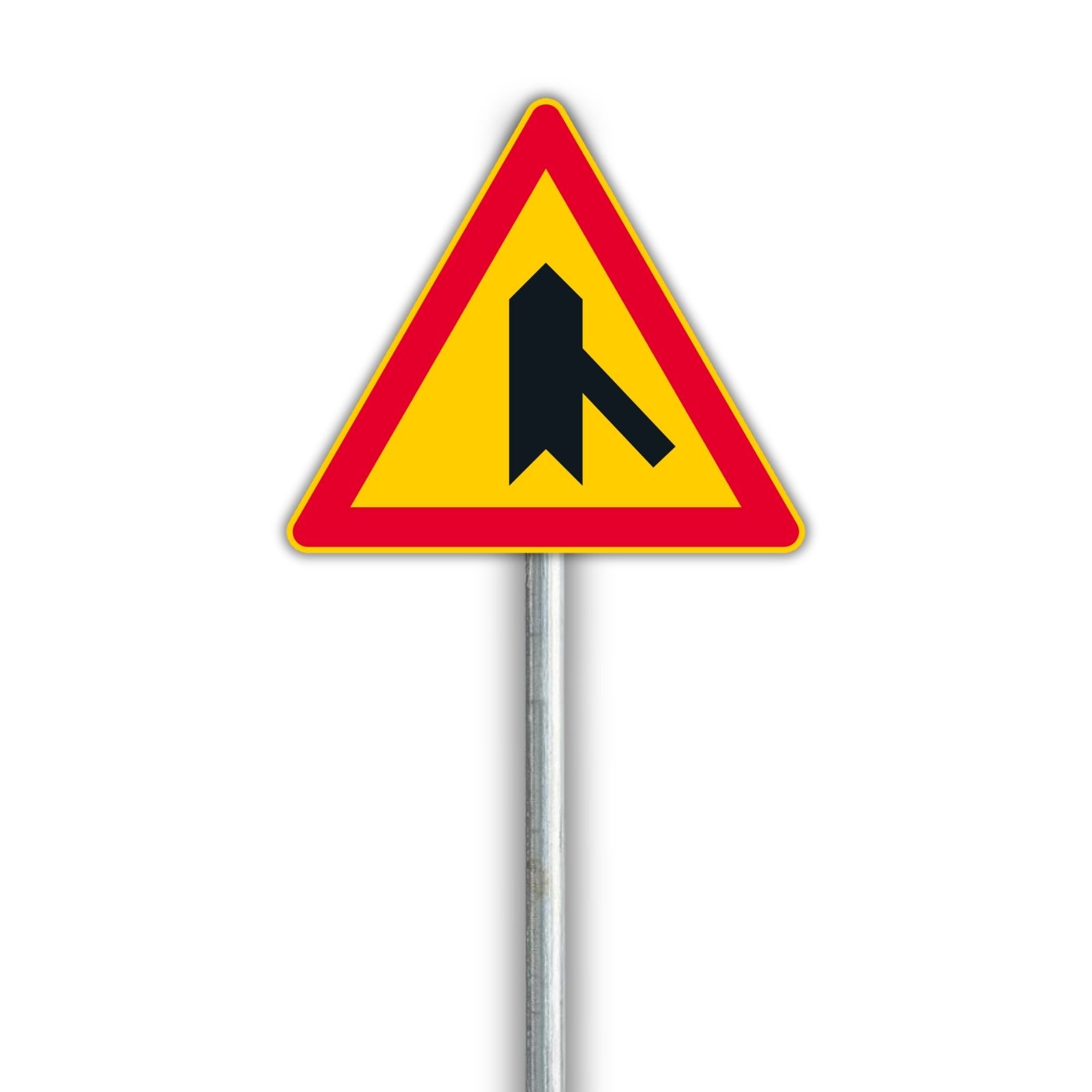 Varoitusmerkki, joka varoittaa oikealta tulevasta sivutien risteyksestä.