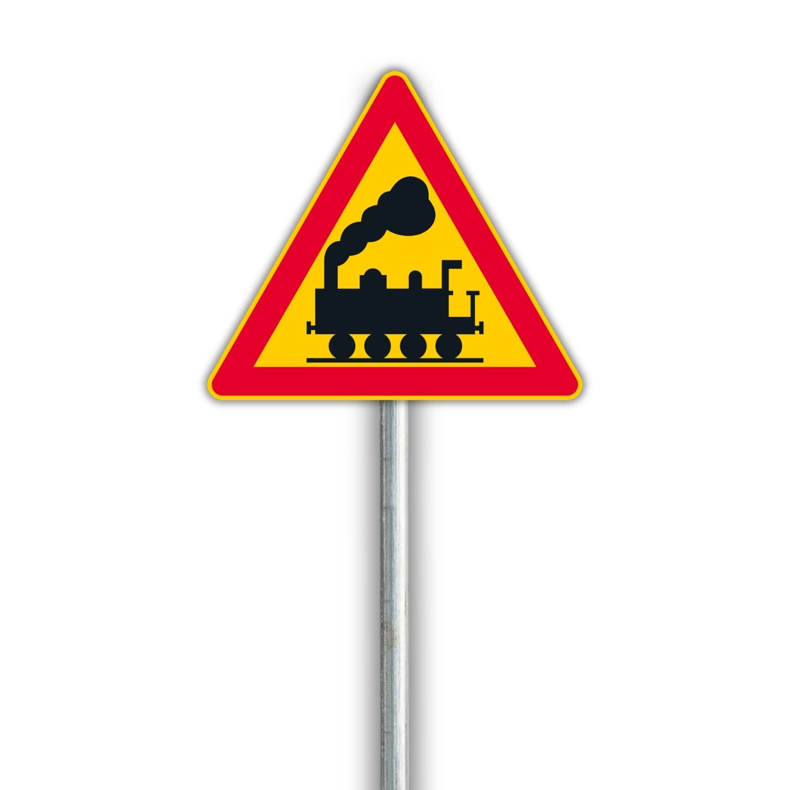 Varoitusmerkki, joka varoittaa rautatien tasoristeyksestä ilman puomeja.