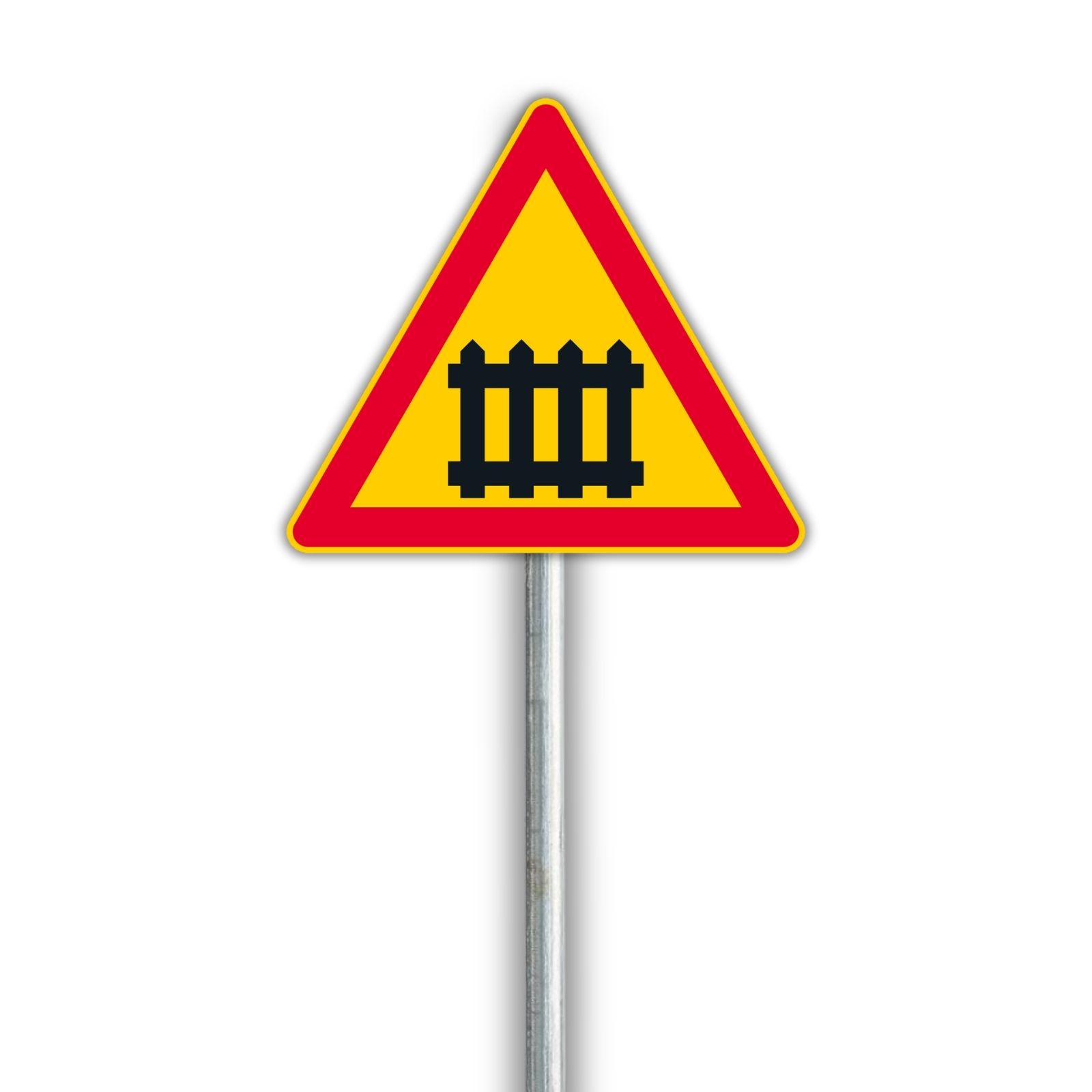 Varoitusmerkki, joka varoittaa rautatien tasoristeyksestä, jossa on puomit.