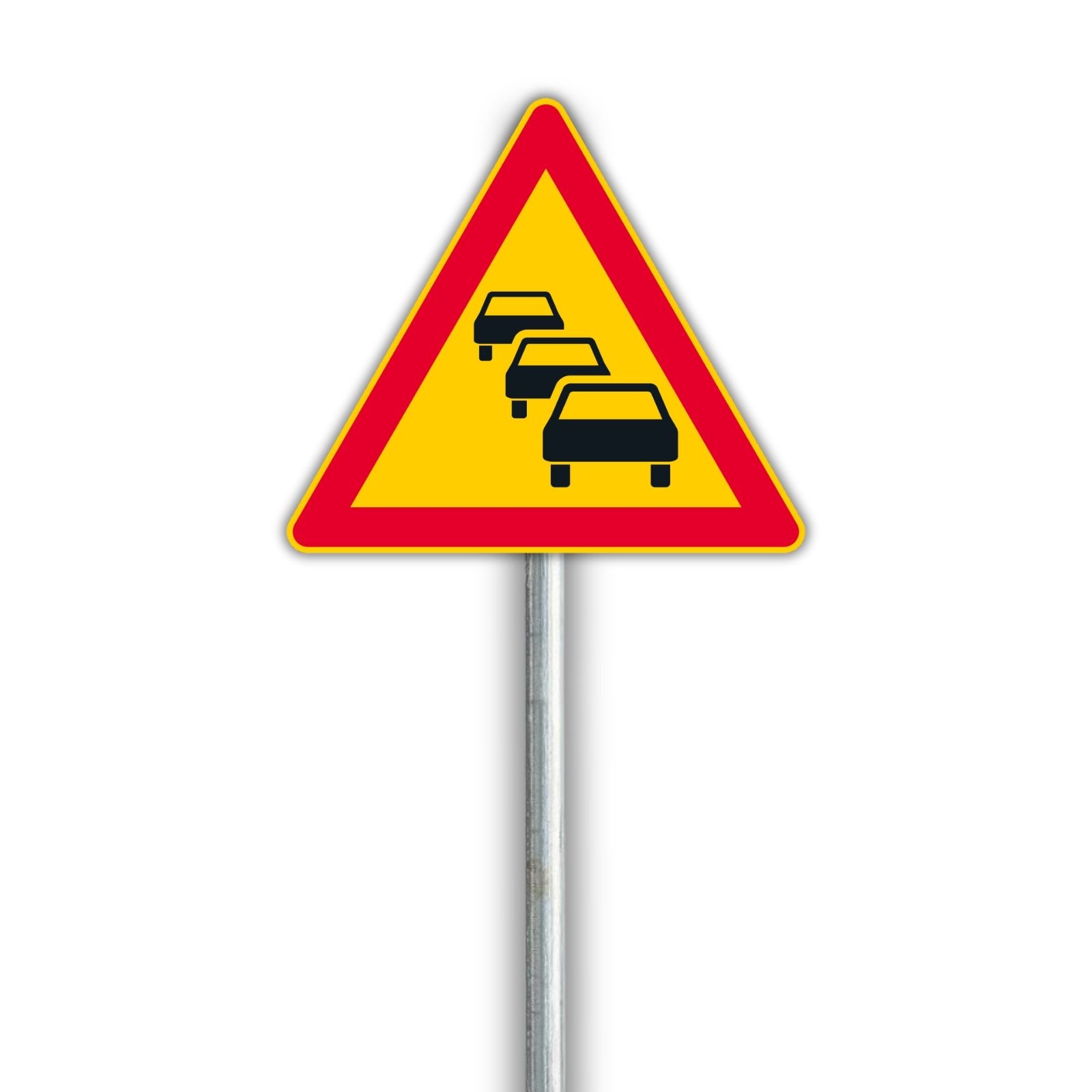 Varoitusmerkki, joka varoittaa edessä olevasta liikenneruuhkasta.