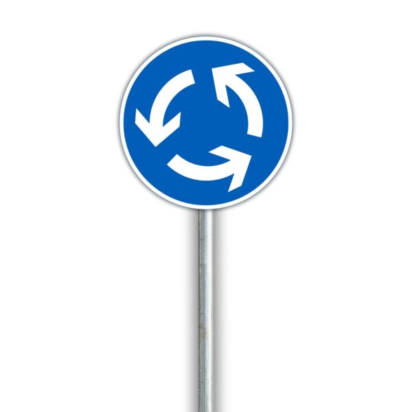 Liikennemerkki, joka osoittaa pakollisen ajosuunnan liikenneympyrässä. Saatavilla vuokraukseen työmaille ja tilapäisiin liikennejärjestelyihin.