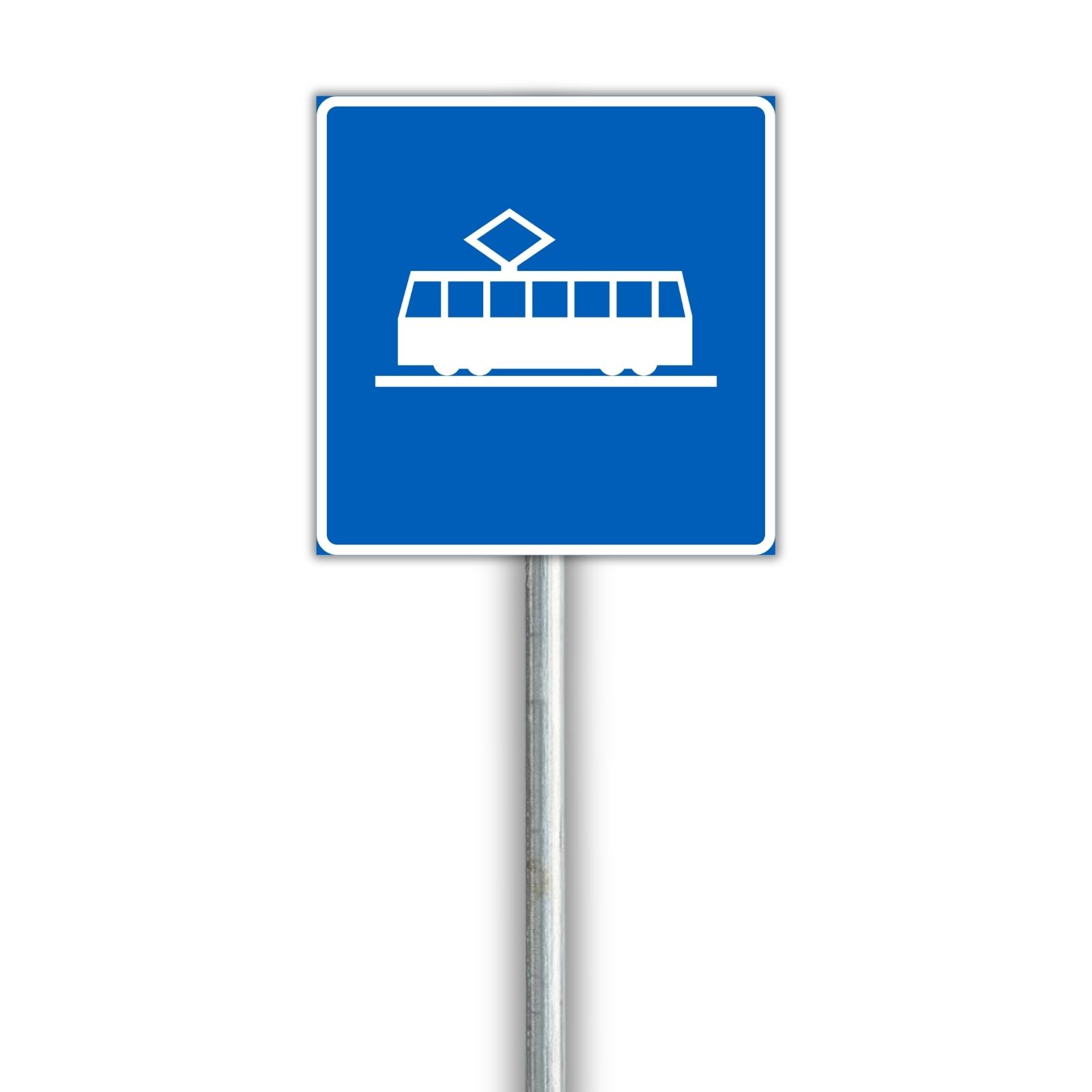 Liikennemerkki, joka osoittaa raitiovaunuille varatun kaistan. Saatavilla vuokraukseen työmaille ja tilapäisiin liikennejärjestelyihin.