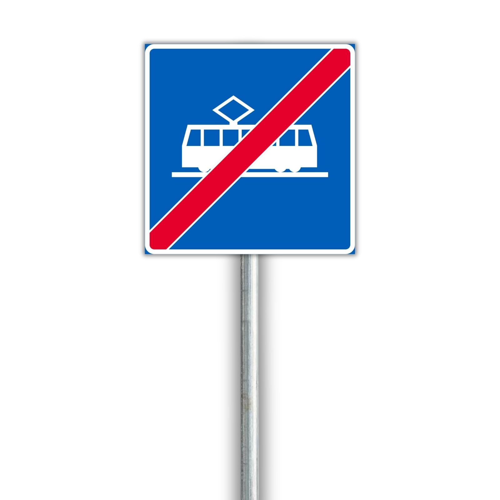 Liikennemerkki, joka osoittaa raitiovaunukaistan päättymisen. Saatavilla vuokraukseen työmaille ja tilapäisiin liikennejärjestelyihin.