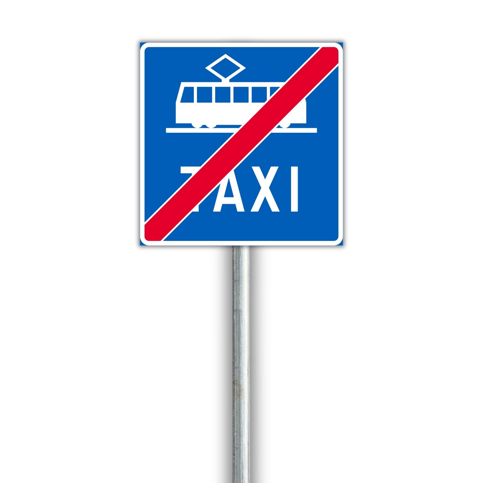 Liikennemerkki, joka osoittaa raitiovaunu- ja taksikaistan päättymisen. Saatavilla vuokraukseen työmaille ja tilapäisiin liikennejärjestelyihin.