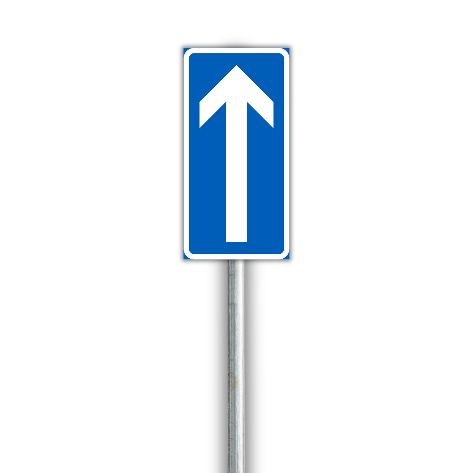 Liikennemerkki, joka osoittaa yksisuuntaisen tien ja ajosuunnan. Saatavilla vuokraukseen työmaille ja tilapäisiin liikennejärjestelyihin.