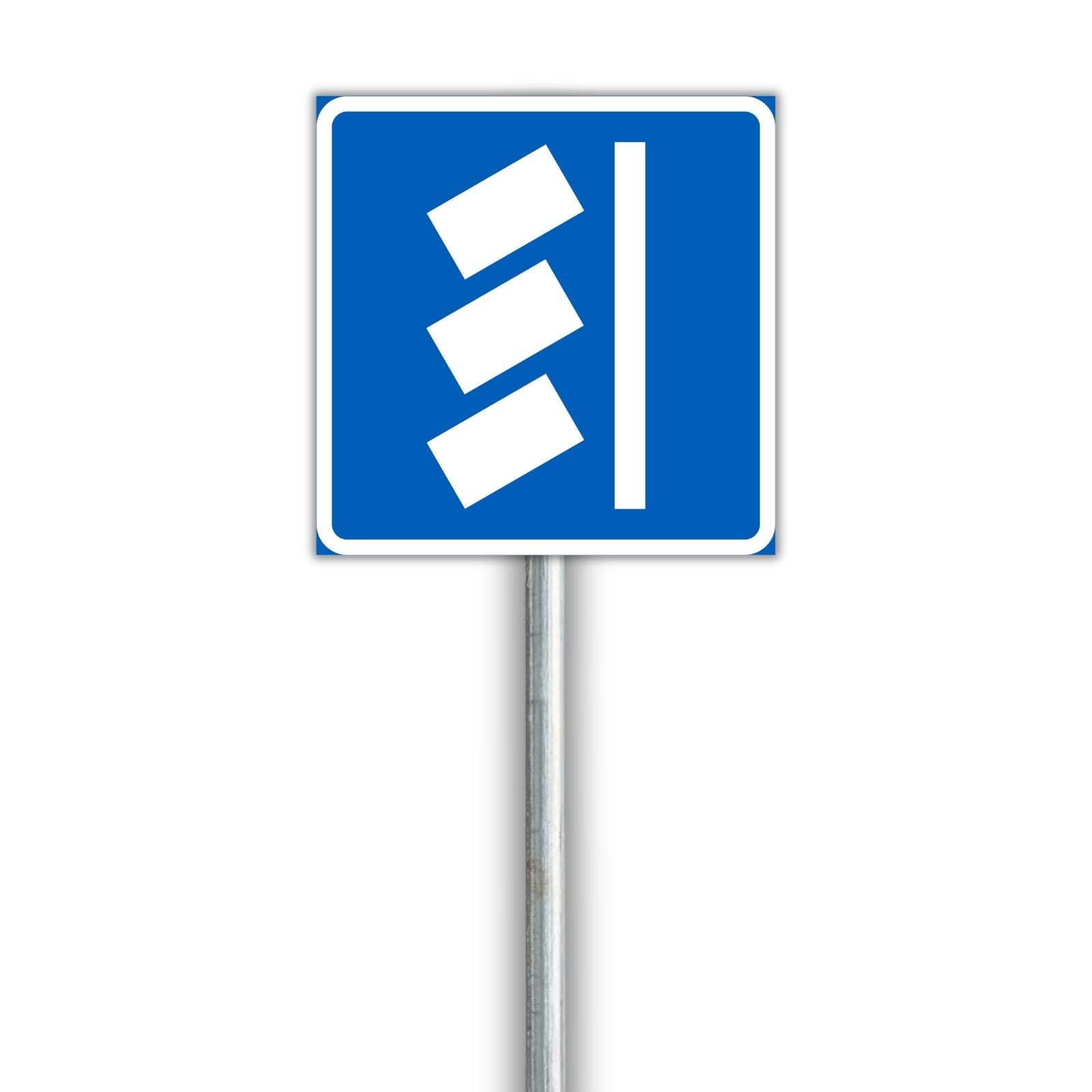 Liikennemerkki, joka osoittaa ajoneuvojen vinon sijoitustavan pysäköintialueella. Käytetään E2- ja E3-merkkien yhteydessä. Saatavilla vuokraukseen.