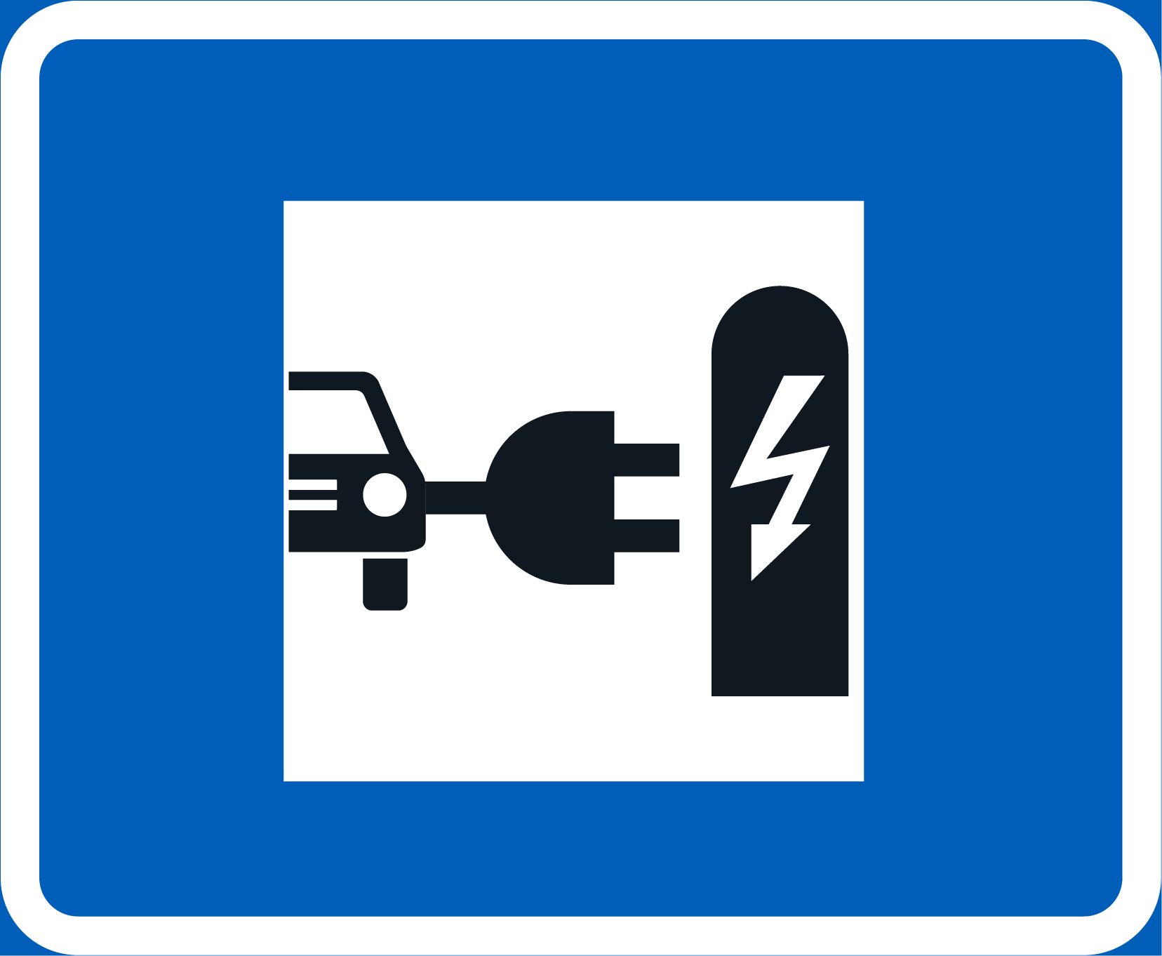 Liikennemerkki, joka osoittaa sähköajoneuvojen latauspisteen. Saatavilla vuokraukseen työmaille ja tilapäisiin kohteisiin.