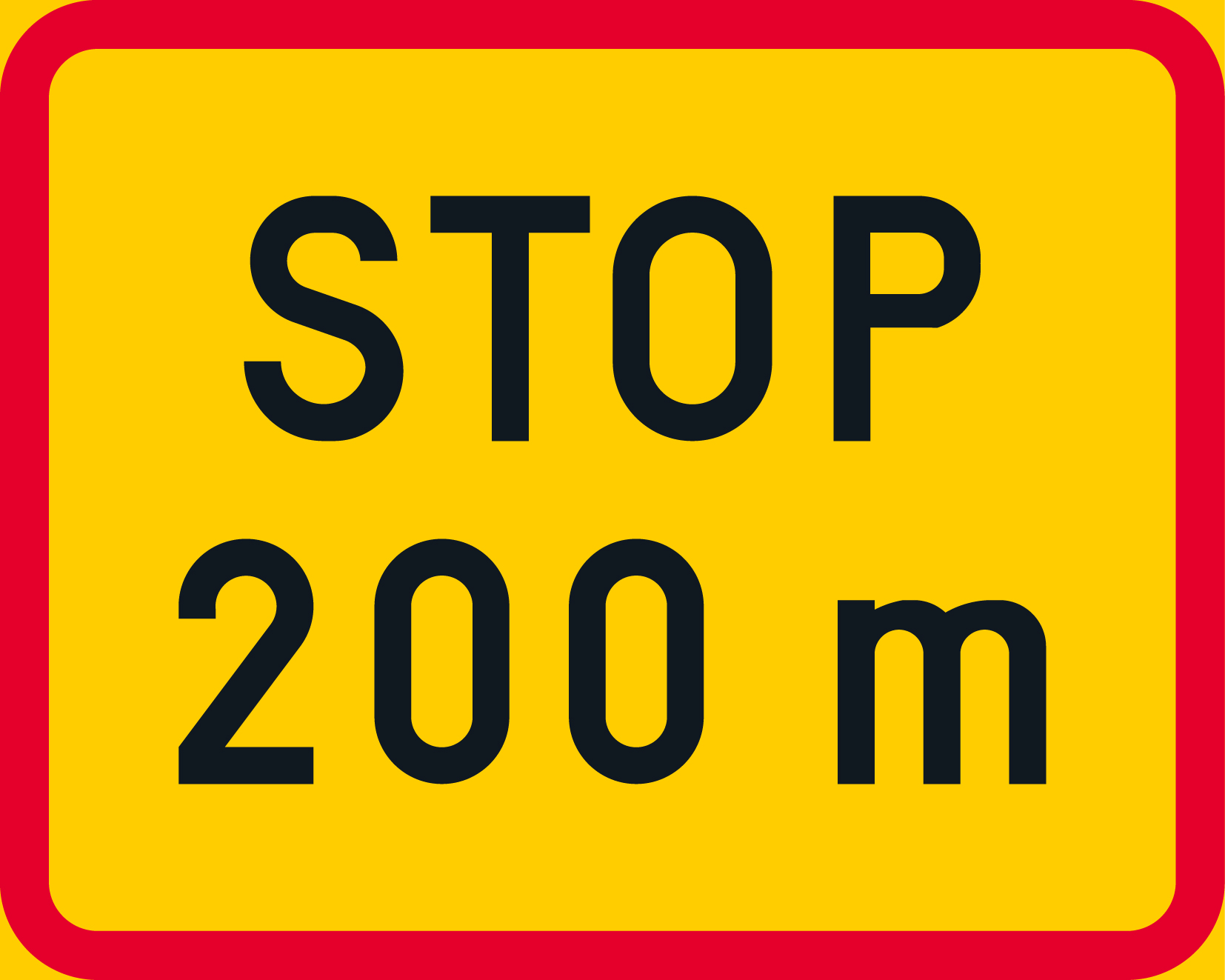 Lisäkilpi, joka ilmoittaa etäisyyden pakolliseen pysäyttämiseen. Saatavilla vuokraukseen työmaille ja tilapäisiin kohteisiin.