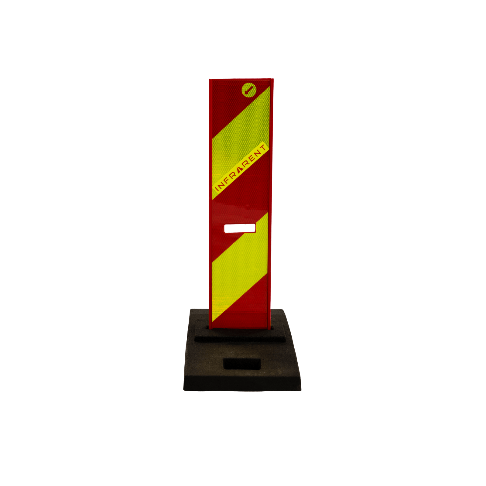 Litteä sulkupylväs jalustalla vuokralle työmaille ja tilapäisiin liikennejärjestelyihin. Erottuva ja helposti siirrettävä ratkaisu työalueiden rajaamiseen ja liikenteen ohjaamiseen.